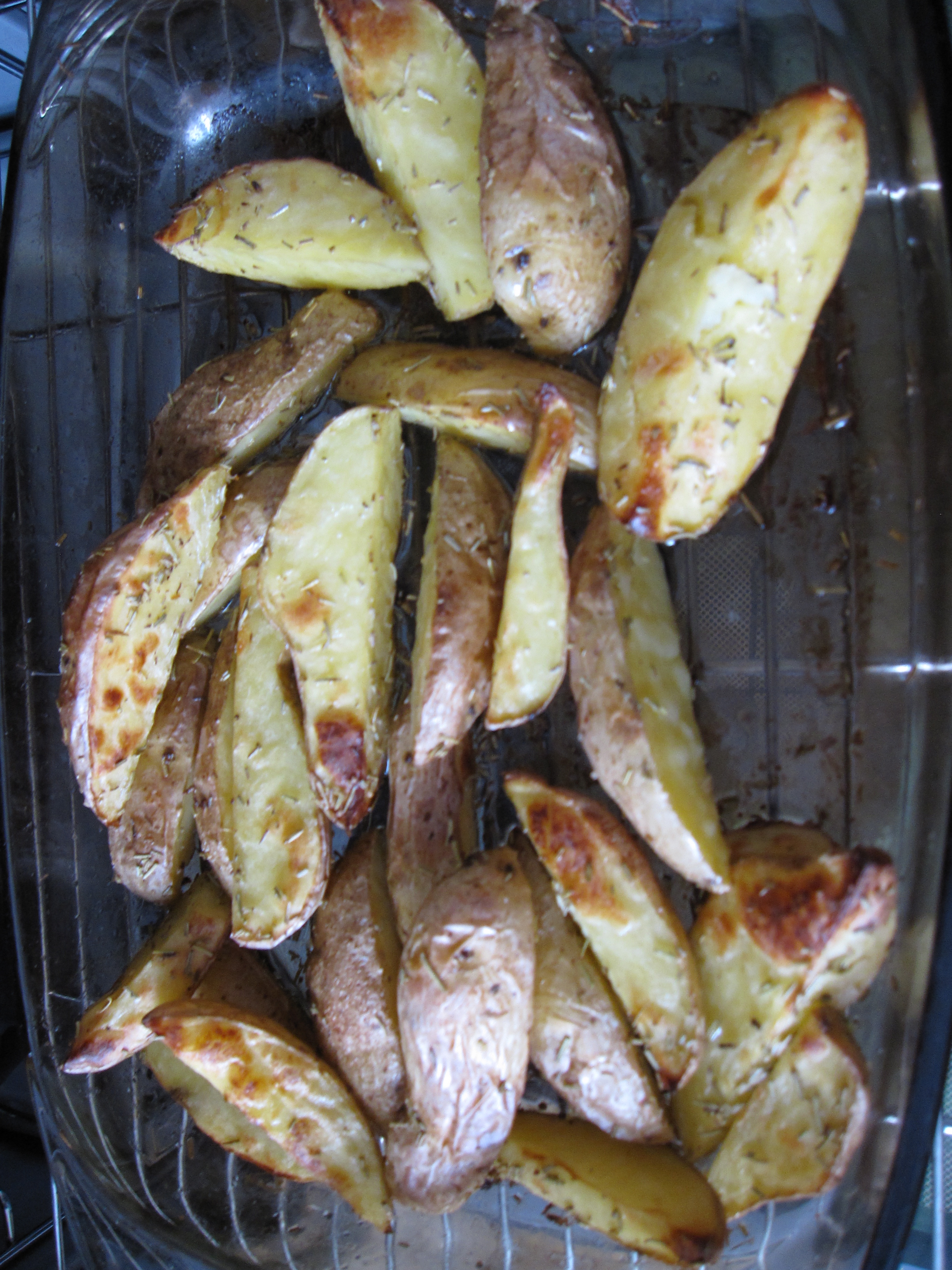 Verser 2càs d’huile d’olive, saler, poivrer et ajouter du romarin. Bien melanger le tout et mettre au four pour 40 à 50 minutes. A mi-cuisson, il faut remuer les pdt.