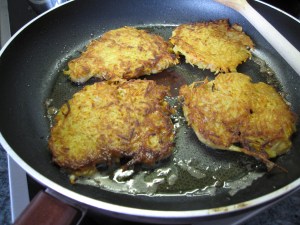 J’épluche 3 grandes carottes, 5 ou 6 pdt (selon la grandeur). Je les râpe (merci Kenwood 🙂 ). Je sèche le tout dans un essuie de cuisine. Ensuite je mets dans un grand pot, j’ajoute 2 ou 3 oeufs selon la quantité, sel, poivre et ensuite il suffit de cuire en galettes dans un mélange margarine-huile d’olive.