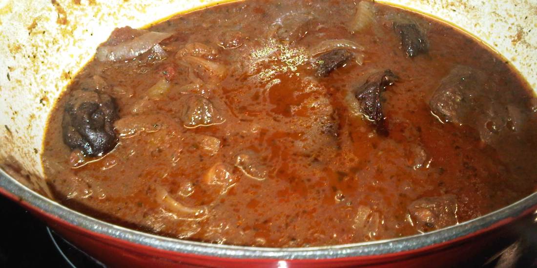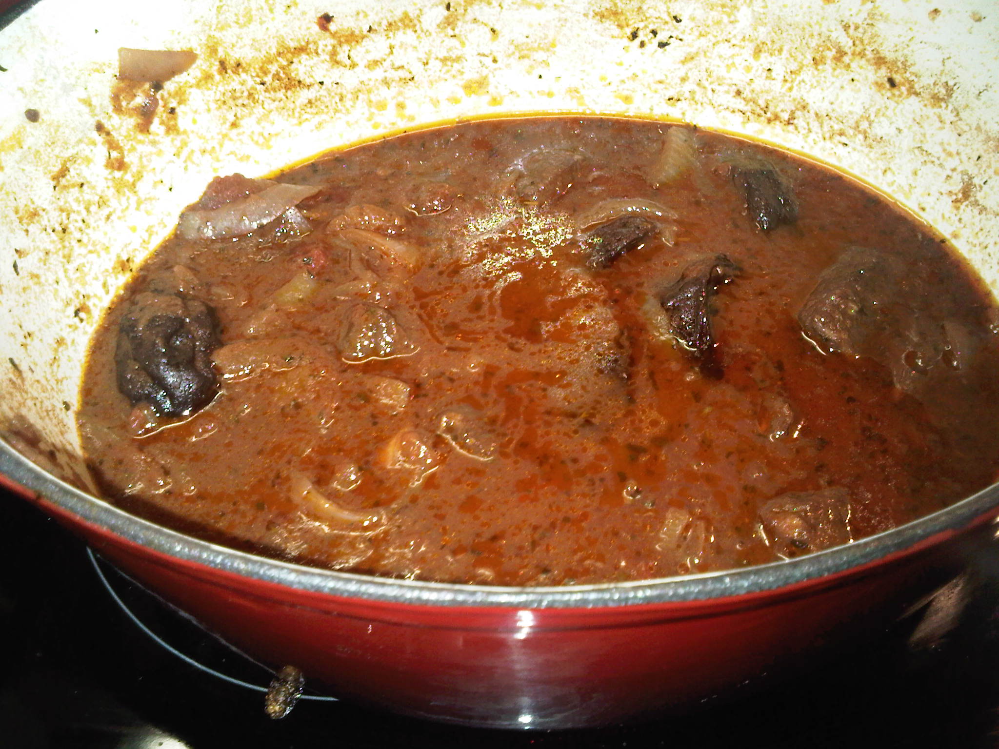 Retirer la viande et faire revenir 2 gros oignons émincés (je les ai coupés en deux et puis en lamelles) dans la matière grasse sans les faire brûnir. Dans la recette originale, il faut ajouter un poivron (ce que je n’ai pas fait car je déteste le poivron). Ajouter une boîte de tomates pelées, la viande, un peu de paprika, de l’origan et dans la recette un peu de cumin (moi pas car je n’en ai pas … et je n’aime pas le goût !), un peu de sel et poivre et un demi cube de bouillon « épices ». J’ai ajouté un demi litre de vin rouge et j’ai laissé mijoter sur feu très doux pendant 2 heures (en remuant de temps en temps).