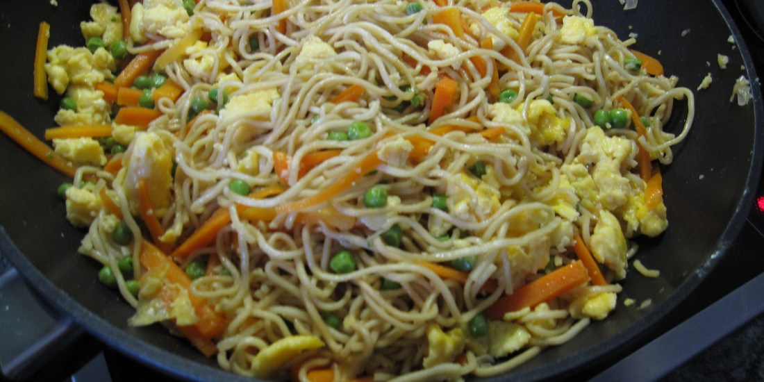 Des nouilles sautées avec petits pois, oeufs brouillés et ce soir du poulet, ail et soja. Waow le soja est resté bien croquant !! miam …