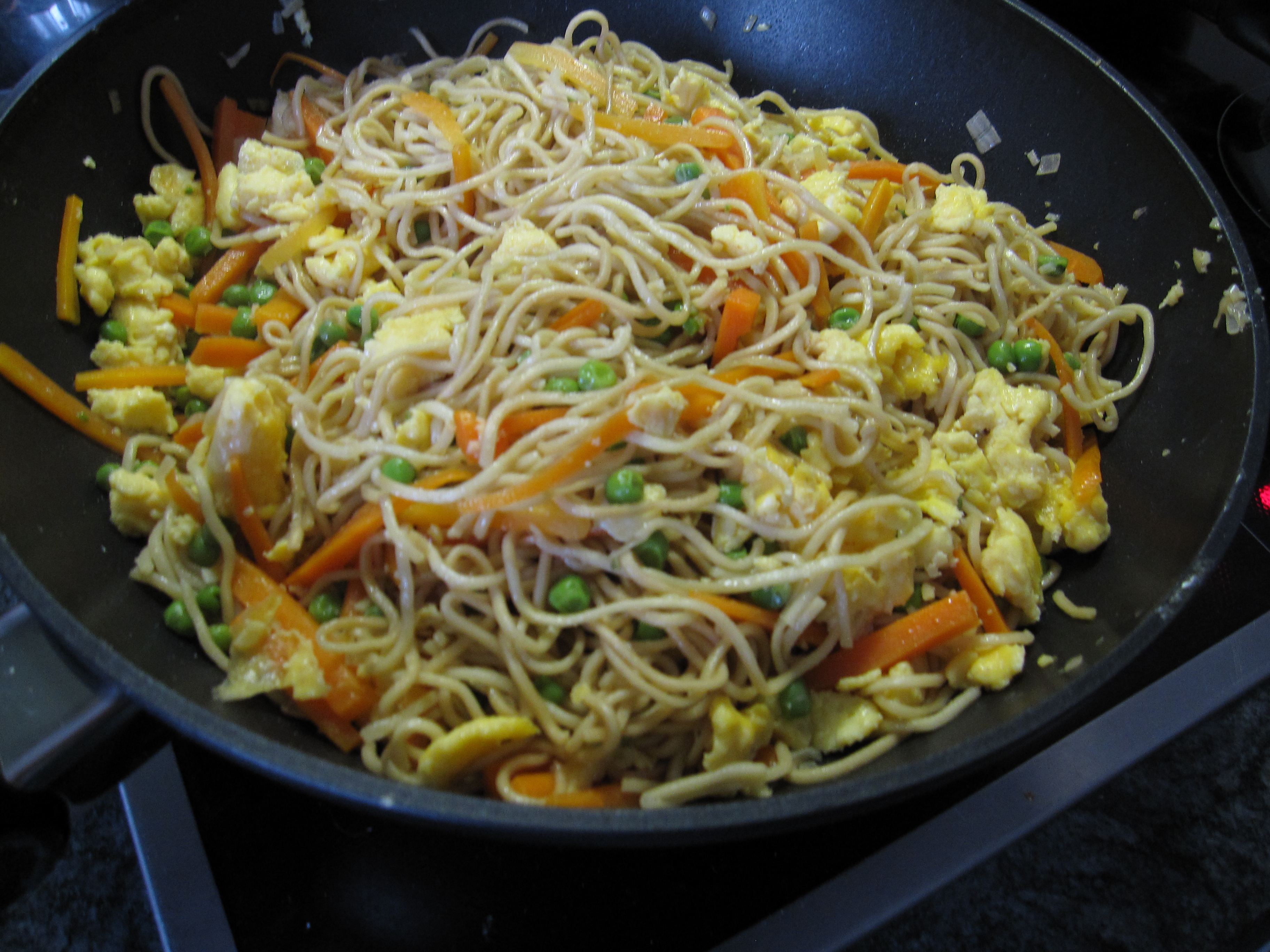 Des nouilles sautées avec petits pois, oeufs brouillés et ce soir du poulet, ail et soja. Waow le soja est resté bien croquant !! miam …