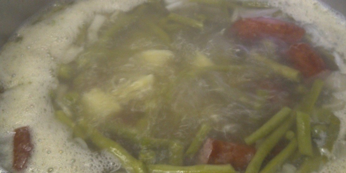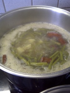 Faire revenir dans 2 bonnes càs de margarine 4 oignons (moi j’ai pris des échalottes) avec 2 saucisses sèches coupées (pour le goût). Ajouter ensuite 1 blanc de poireau coupé finement (je n’en avais pas et n’en ai pas mis).