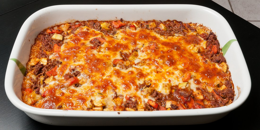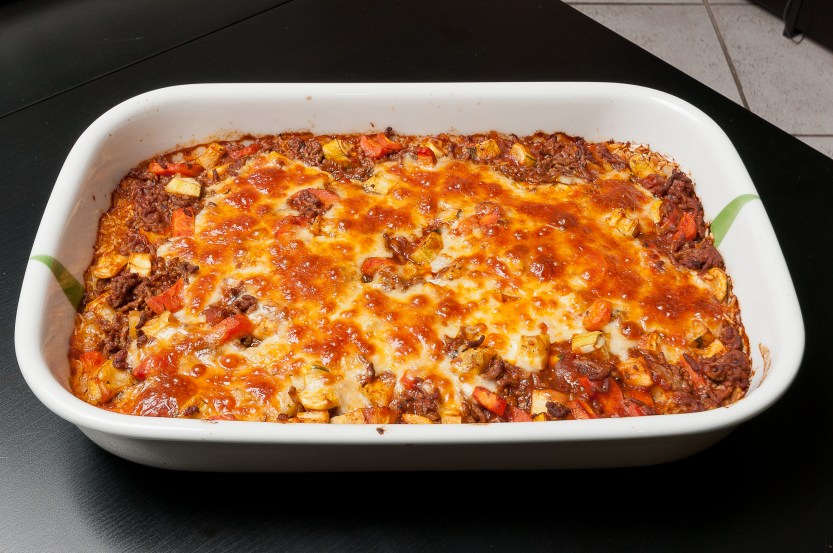 1 oignon émincé, 2 càc d’huile, 125 de riz non cuit, 1 gousse d’ail, 400 g d’américain nature, 1 boîte de tomates (moi je prends de la Miracoli basilico), 1/2 cube de bouillon « légumes », 4 petites courgettes, 4 carottes moyennes, 100g de gruyère (moi je prends de la mozzarella râpée), herbes de provence, sel et poivre.