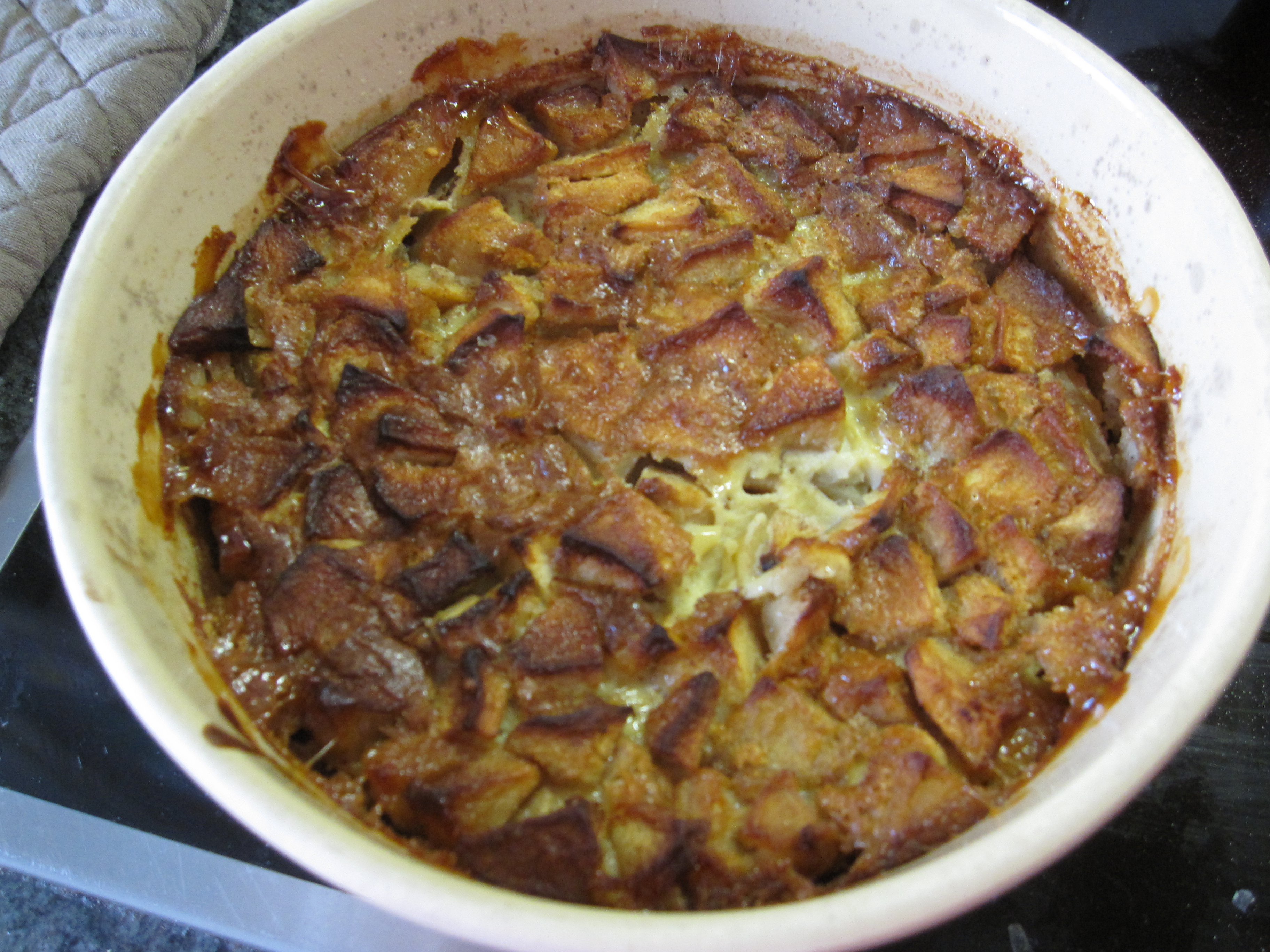 Répartir les pommes dans un moule à manqué d’une contenance de 50 cl. Verser la pâte et enfourner pendant 25 minutes selon la recette (finalement il a cuit 60 minutes !). Saupoudrer de sucre vanillé si vous aimer. Servir tiède ou froid et éventuellement avec une boule de glace vanille 🙂