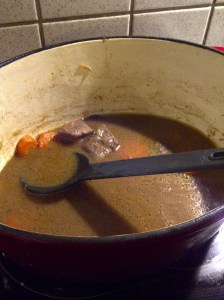 J’ai fait rissoler deux oignons coupés en rondelles dans un peu d’huile d’olive. J’ai ajouté un peu de farine pour qu’ils brunissent. J’ai ajouté 400 g de viande à carbonnade que j’ai laissé brunir. Ensuite j’ai versé une bouteille de bière brune (maredsous) et j’ai ajouté 3 grosses carottes coupées en lamelles. J’ai salé, poivré et ajouté des feuilles de laurier. J’ai ajouté un morceau de sucre de canne pour couper le côté amer de la bière.