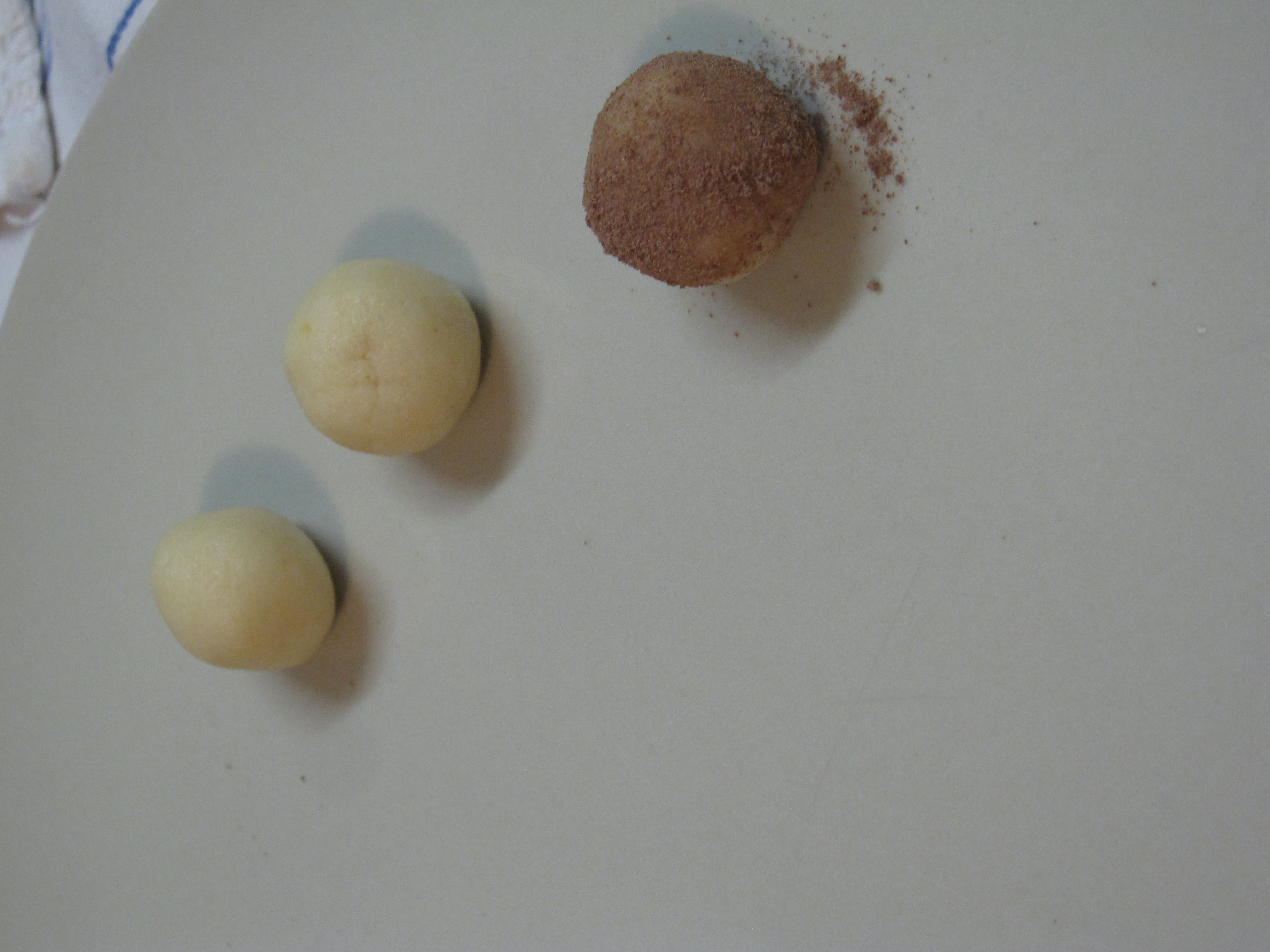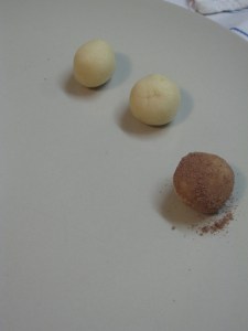 Ajouter 2,5 cl d’eau et 1 goutte d’essence d’amande (2 si vous aimez le goût fort). Bien malaxer et former des boulettes que vous roulez ensuite dans du cacaco … je préfère le cacao pur au fameux « N… k » que les enfants aiment 🙂