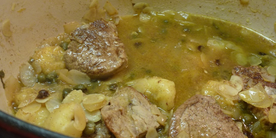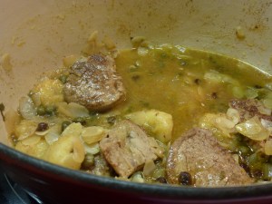 Couper 2 bananes en rondelles et les faire revenir dans 1 càs d’huile. Ajouter à la viande avec 40 g d’amandes effilées.