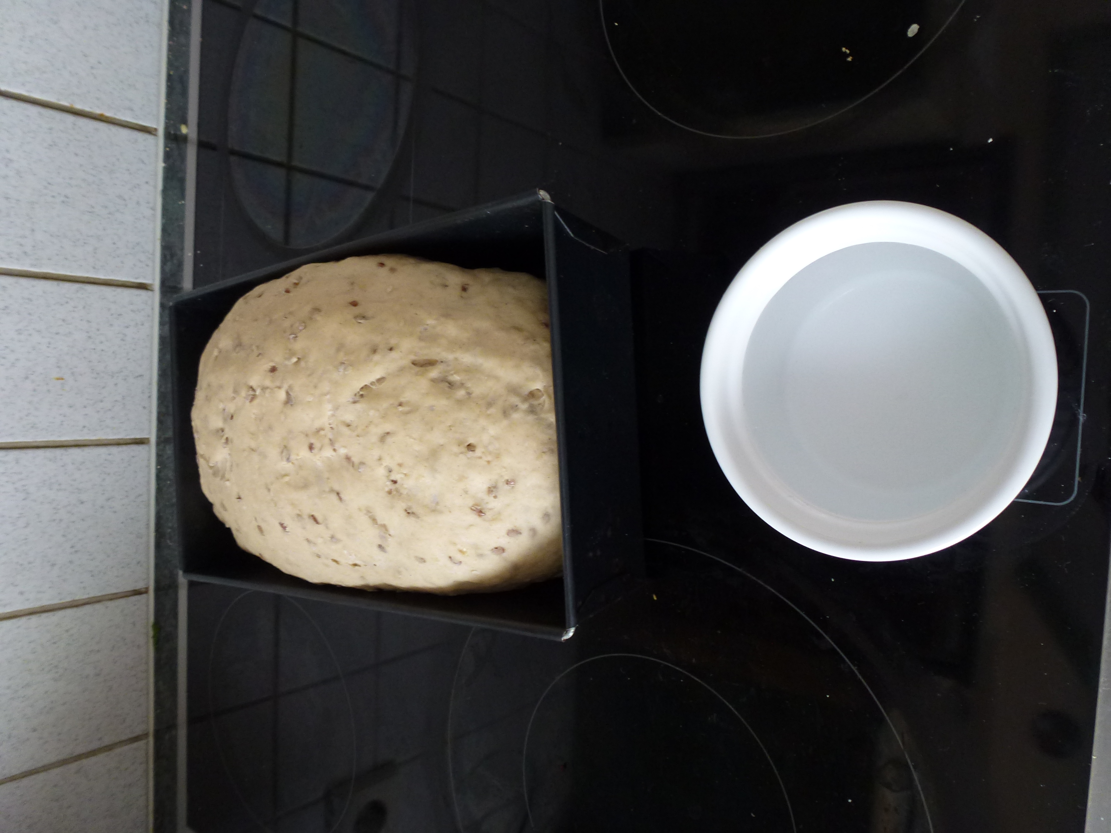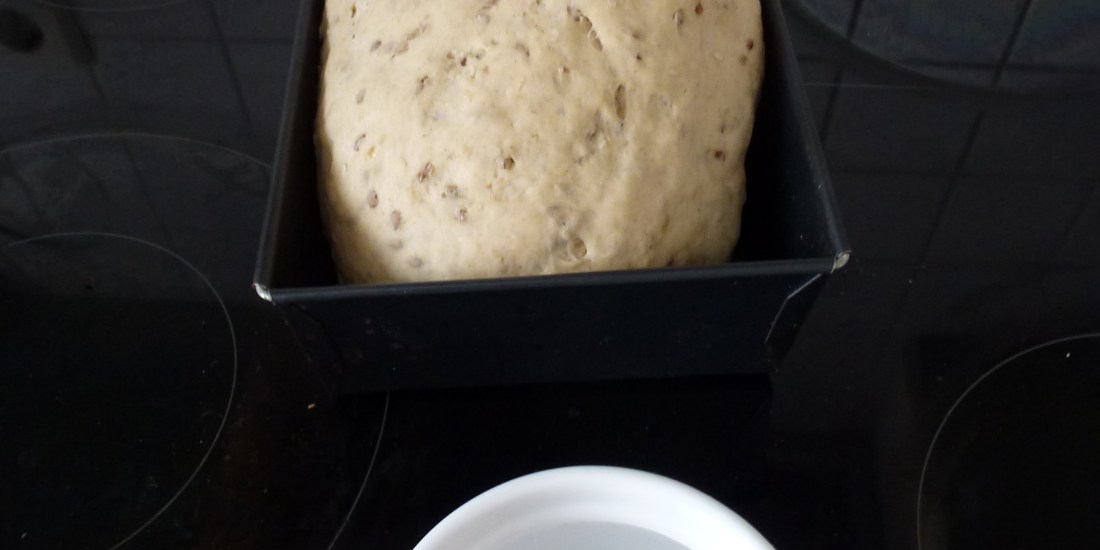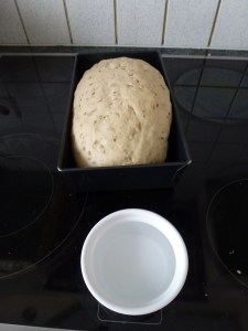 Pétrir à nouveau la pâte et moi je la frappe sur la table pour bien l’aérer. Former une pâte oblongue et la déposer dans un moule à pain huilé. Couvrir d’un essuie et laisser reposer pendant 30 minutes.