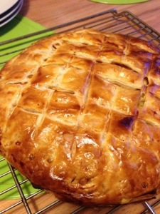Humidifier le bord de la pâte avec un peu d’eau et recouvrir avec la deuxième pâte feuilletée découpée (moi j’avais fait un cercle plus petit en utilisant le cercle intérieur). Pincer les deux bords ensemble. Avec un couteau faire le dessin sur la pâte du dessus et badigeonner avec un jaune d’oeuf délayé avec un peu d’eau.