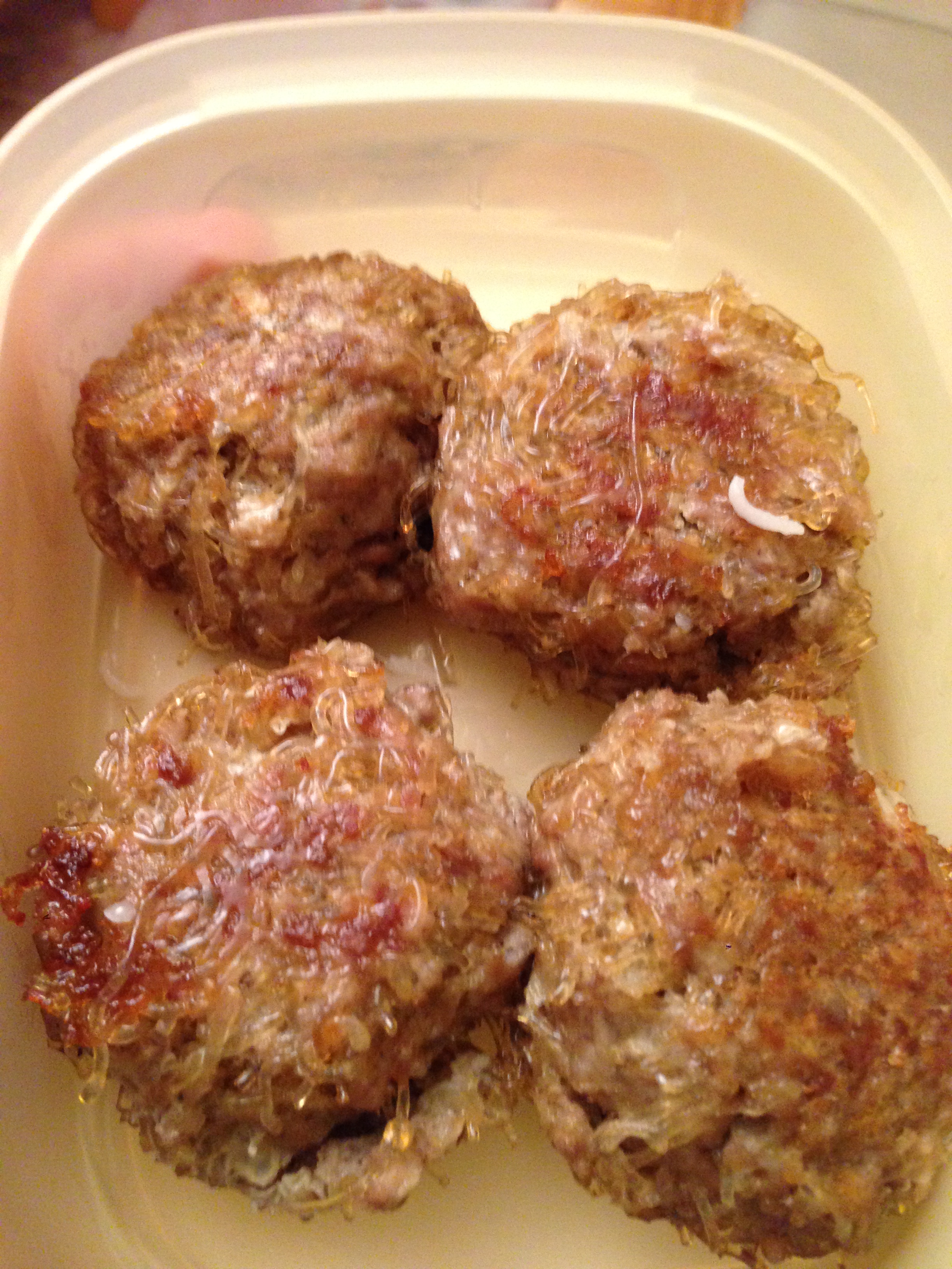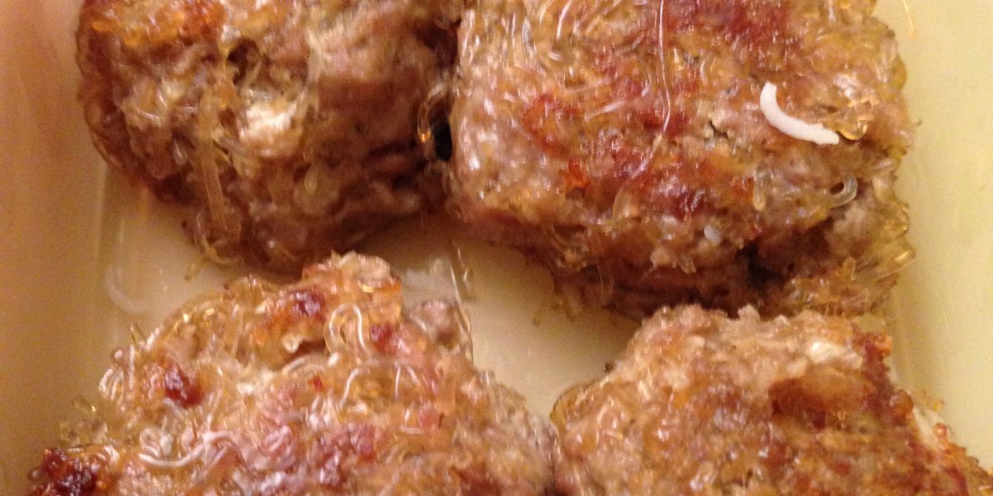 Mélanger le tout avec 400g de haché de viande , un oeuf cru, 2 càs de sauce soja, 1 c à café de sucre, du poivre et amalgamer pour obtenir une pâte homogène. La recette dit de faire des boulettes et de les cuire dans de l’huile.