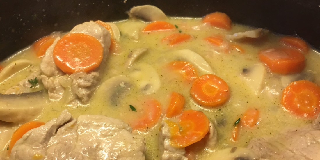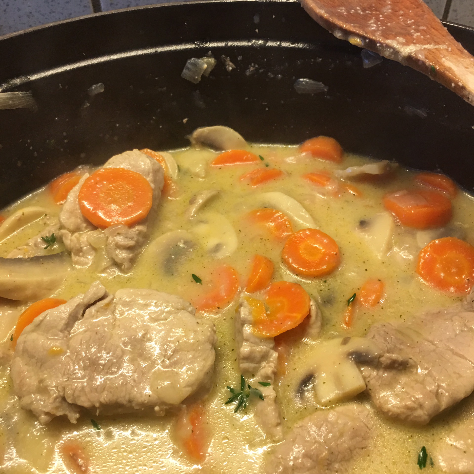 J’ai fait revenir deux oignons dans ma cocotte puis j’ai rajouté les tranches de filet de porc que j’ai fait brunir. Ensuite j’ai ajouté 3 grosses carottes coupées en rondelles et des champignons coupés en tranches. J ai versé 200 ml de bouillon (eau + cube de bouillon de légume) et j ai laissé mijoter 20 minutes. J a salé et poivré et ajouté du thym frais. A la fin, j ai rajouté 1 cs de philadelphia . Comme ma sauce était trop liquide, je l’ai épaissie avec un peu de maizena express.